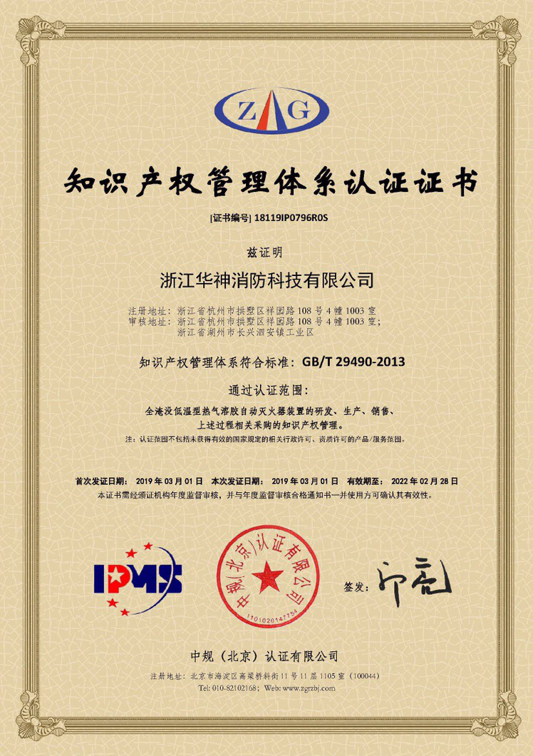 華神消防于2019年3月1日正式獲得由中規(guī)(北京)認(rèn)證公司頒發(fā)的《知識(shí)產(chǎn)權(quán)管理體系認(rèn)證證書》(證書編號(hào):18119IP0796R0S),這標(biāo)志著我司在知識(shí)產(chǎn)權(quán)創(chuàng)造、運(yùn)用、管理和保護(hù)方面全面邁入國內(nèi)領(lǐng)先水平。